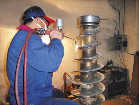 6、關(guān)鍵部位防腐、耐磨。螺旋推料面、螺旋體進(jìn)料分布部位及轉(zhuǎn)鼓出渣口等關(guān)鍵部位一般均噴焊或堆焊硬質(zhì)合金耐磨層,特殊用途離心機(jī)則 采用鑲片式硬質(zhì)合金耐磨塊或鑲耐磨套或貼耐磨陶瓷片,防腐、耐磨、使用壽命長。